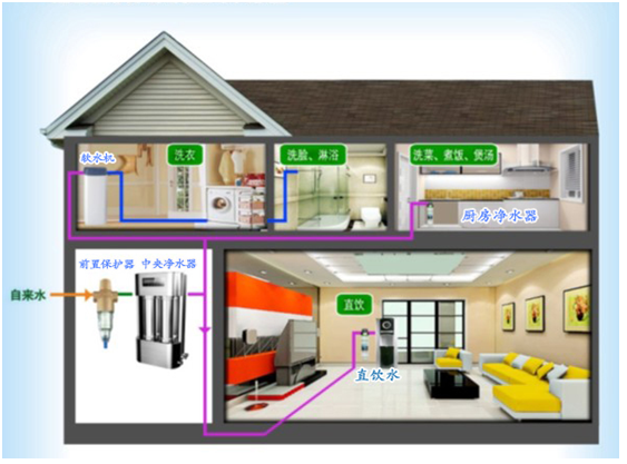 Home the whole house (villa) the purification of drinking water from the solution can be divided into two ways, first is a household water pipe in an appropriate location to install central water purifier, centralized purification. The second is the family of each terminal point of water purification.